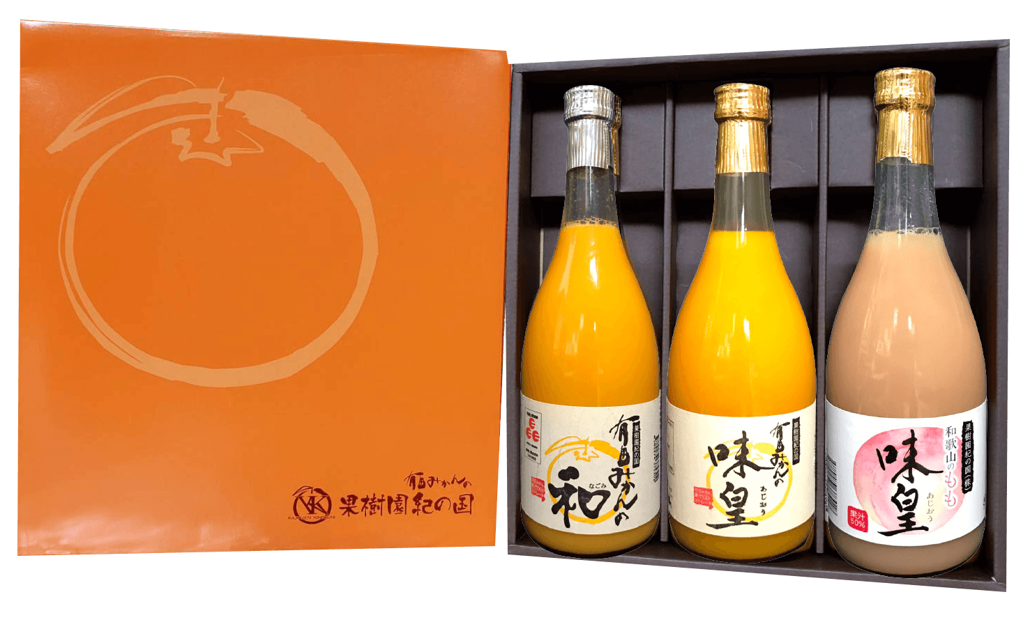 果実そのものを十分に味わえるように贅沢な搾り方をした「味皇」のみかんともものストレートジュース。そして、まろやかなとろみ感と濃厚なうまさの「和」がセットになった人気商品。贈答用にもおすすめです。